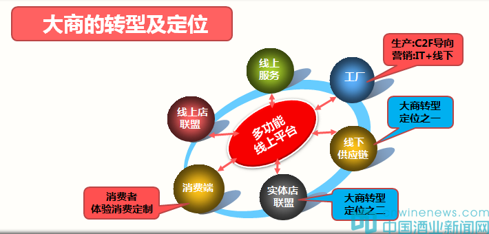 大商要跟上在這次行業轉型的步伐,就必須通過深入分析變革的大趨勢看清楚轉型的本質。筆者認為,轉型的本質就是要求營銷理念從廠家導向轉向消費導向或者說是從生產導向轉向市場導向。按照這一理念,依托互聯網建立以消費為導向的C2F型商業模式就是整個行業轉型的大方向。所謂C2F就是從消費端出發經過終端和物流以及信息平臺到達工廠的商業流程。因為,互聯網的飛速發展使得生產與消費之間的距離幾乎為零;信息的高度透明和對稱使得價格背離價值的現象得以糾正;消費觀念回歸理性使得虛假的賣點和概念逐漸失去市場。因此,所有的企業都將沿著C2F模式方向探索,最終建立起行業共享型互聯網+實體的融合模式,不同的是各環節企業需要在這個行業大模式中找到自己的定位。關于未來互聯網+實體的行業共享型模式如圖所示。