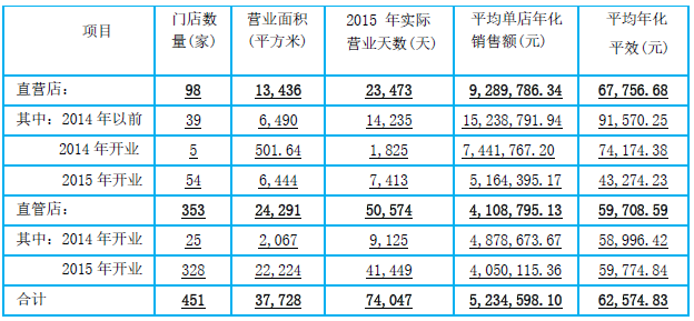 分析門店年化銷售額及年化平效表,記者發(fā)現(xiàn),直管店的整體平效為5.97萬元,直營店的整體平效為6.78萬元,451家門店的平均平效為6.26萬元。