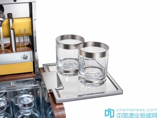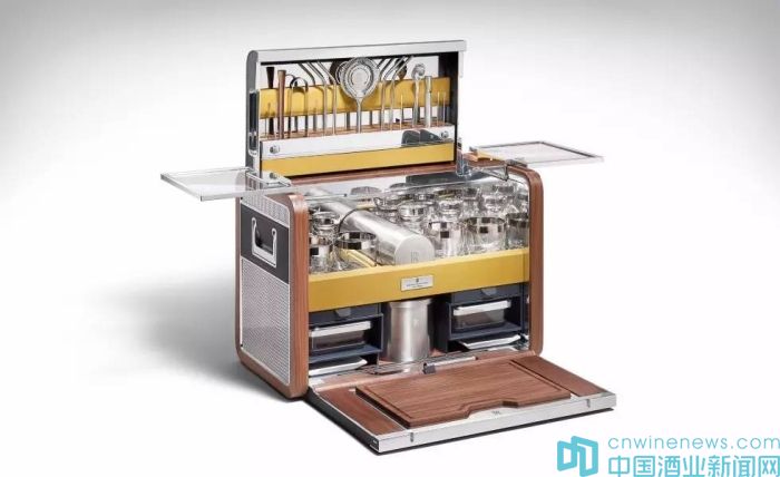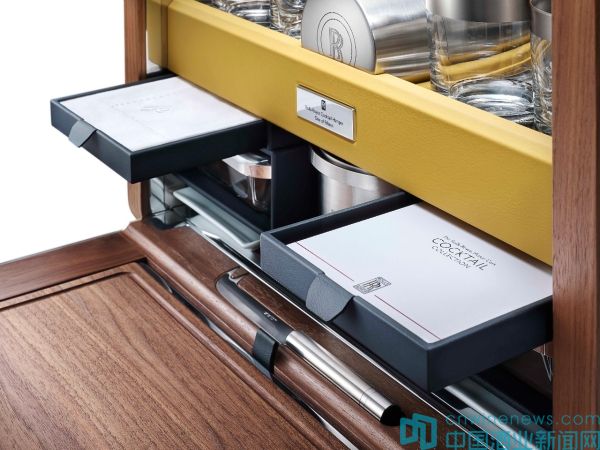 每一件這樣的雞尾酒柜需要耗時8周才能手工制作完成。它由勞斯萊斯的裝飾設計師Sina Maria Eggl設計。采用和轎車內飾一樣的美國胡桃木以及真皮,內部分為上下兩層,內部結構十分精巧。