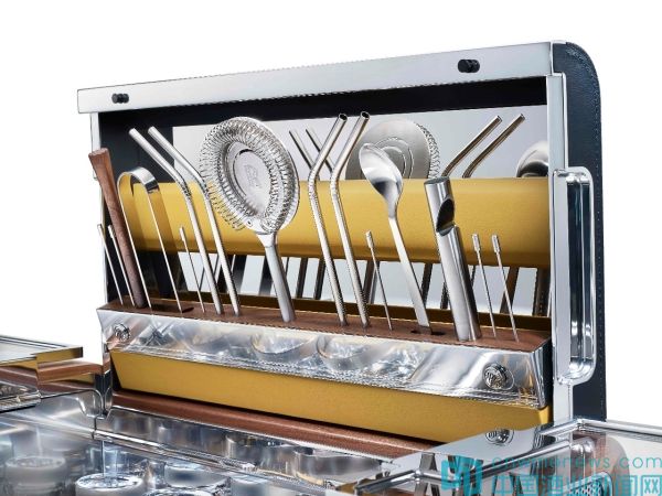 酒柜下層中央是一個小小的冰桶,而兩邊則是兩個裝小食的小碟子,而碟子上方的抽屜中則存放了雞尾酒配方卡片和紙巾,所以你不用害怕記不住配方丟面子。酒柜的上層則裝有玻璃杯、醒酒器和搖壺。金屬的調酒工具都刻有勞斯萊斯特有的雙R標記,而玻璃器皿則都來自于歐洲最著名的玻璃器皿生產商Theresienthal。刀具則巧妙地通過磁力收納在壁板中,以防止操作不便或者割傷。