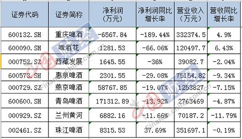 資料顯示,目前A股市場上共有8家啤酒類上市公司,2015年合計實現營業收入500.63億元,同比下降9.77%;合計實現凈利潤24.39億元,同比降幅23.98%。