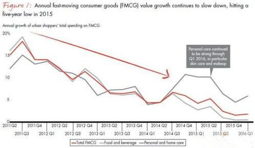 據管理咨詢公司貝恩 (Bain & Company)和全球市場研究機構Kantar Worldpanel昨日聯合發布的報告,以消費量計,去年中國城市快消品消費同比下滑0.9%,2014年則為增長0.1%。從消費價值看,去年快速消費品增速降至3.5%,創五年新低。