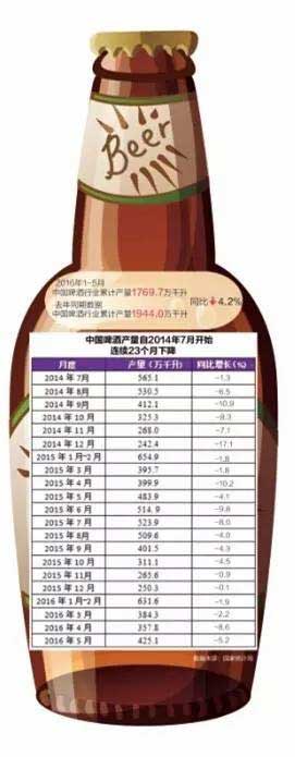 當下啤酒行業的現狀依舊不容樂觀, 2014年6月,我國啤酒行業結束了二十年的正增長,產量首現下滑并持續至今,行業盈利仍處在尋底過程中。2014年我國啤酒產量同比下降0.96%,2015年的數字是-5.06%;2016年1~4月是-6.3%。