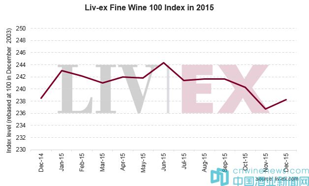 2015年12月份Liv-ex 100月結238.26點,微升0.7%,上升幅度卻不足以使過去一年重回正增長;相反,它令2015年年結持平,只比2014年的年結水平(238.50點)略低0.1%。而Liv-ex 50自11月份的下滑后,在12月份有所回升,月結264.88點,但仍比2014年的年結水平(266.83點)低0.7%。