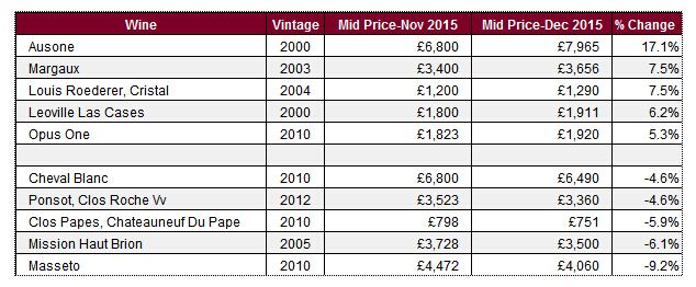在上月的五大漲價葡萄酒排行榜中,歐頌堡Ausone 2000(帕克98+分)榮登榜首,而第二位則為瑪歌Margaux 2003年(98分)。作品一號Opus One 繼續表現良好,其2010年份漲價了5.3%。相反, 在12月份跌價最大的卻是兩款100滿分的葡萄酒:白馬Cheval Blanc 2010年和于去年6月獲得評分升級的美訊Mission Haut Brion 2005年。
