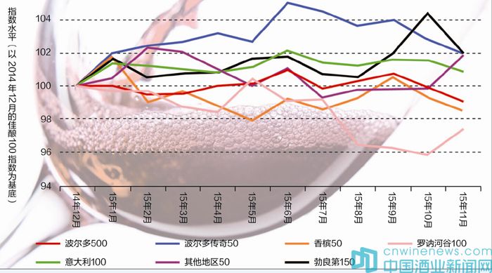 截至2015年11月底,波爾多500(Bordeaux 500)指數下跌了0.9%,而Liv-ex1000的三大次級指數卻達到了2015年的最高點。