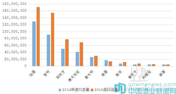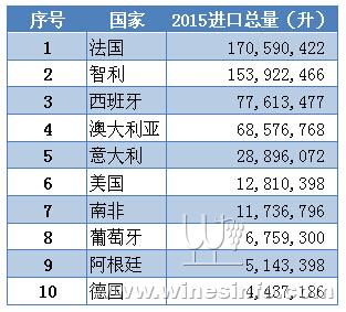 2015年葡萄酒進口總量來源國排名前十名