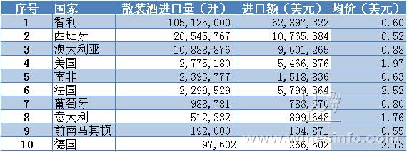 在進口散裝葡萄酒中,智利以105,125,000升雄踞榜首,然后依次為西班牙、澳大利亞、美國、南非、法國、葡萄牙、意大利、前南馬其頓、德國。