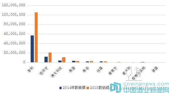 2015年散裝葡萄酒進口量來源國排名前十名