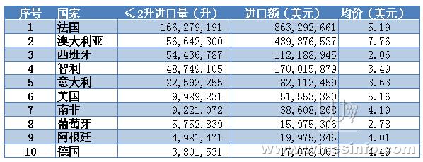 進口瓶裝葡萄酒方面,≤2升進口葡萄酒排名依次為:法國、澳大利亞、西班牙、智利、意大利、美國、南非、葡萄牙、阿根廷、德國。葡萄牙的名次比去年提升一位。