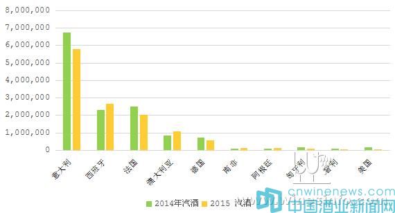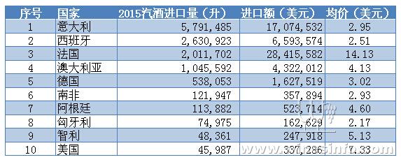2015年汽泡酒進口量有所下滑,按進口量排名依次為:意大利、西班牙、法國、澳大利亞、德國、南非、阿根廷、匈牙利、智利、美國。