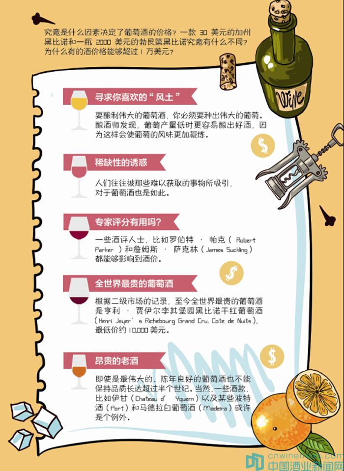 葡萄酒的價格千差萬別,即使是同一產區、同一年份、同一品種的酒價格也大相徑庭。你不禁會問:究竟是什么因素決定了葡萄酒的價格?一款30美元的加州黑比諾和一瓶2000美元的勃艮第黑比諾究竟有什么不同?為什么有的酒價格能夠超過1萬美元?對于收藏者來說,了解葡萄酒的定價機制幫助你決定哪款酒值得投資。