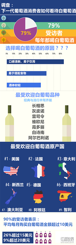 從調查結果來看,絕大部分的葡萄酒消費者都表示接受白葡萄酒,而白葡萄清新酸爽、易于佐餐和容易飲用的特點也是吸引眾多消費者的原因之一。在最受歡迎的白葡萄品種調查當中,霞多麗(Chardonnay)不再獨霸天下,而是各個白葡萄品種百花齊放,長相思(Sauvignon Blanc)的馥郁、雷司令(Risling)的全能、灰皮諾(Pinot Gris)的酸爽都在消費者心目中留下深刻的印象,同時他們也非常愿意嘗試由不同葡萄品種釀造而成的白葡萄酒。另外,新世界和舊世界的競爭還在持續,市場上有越來越多的白葡萄酒提供給消費者選擇,相信在不久的將來,白葡萄酒一定能夠在市場上擁有足夠多的話語權來與其他葡萄酒抗衡。