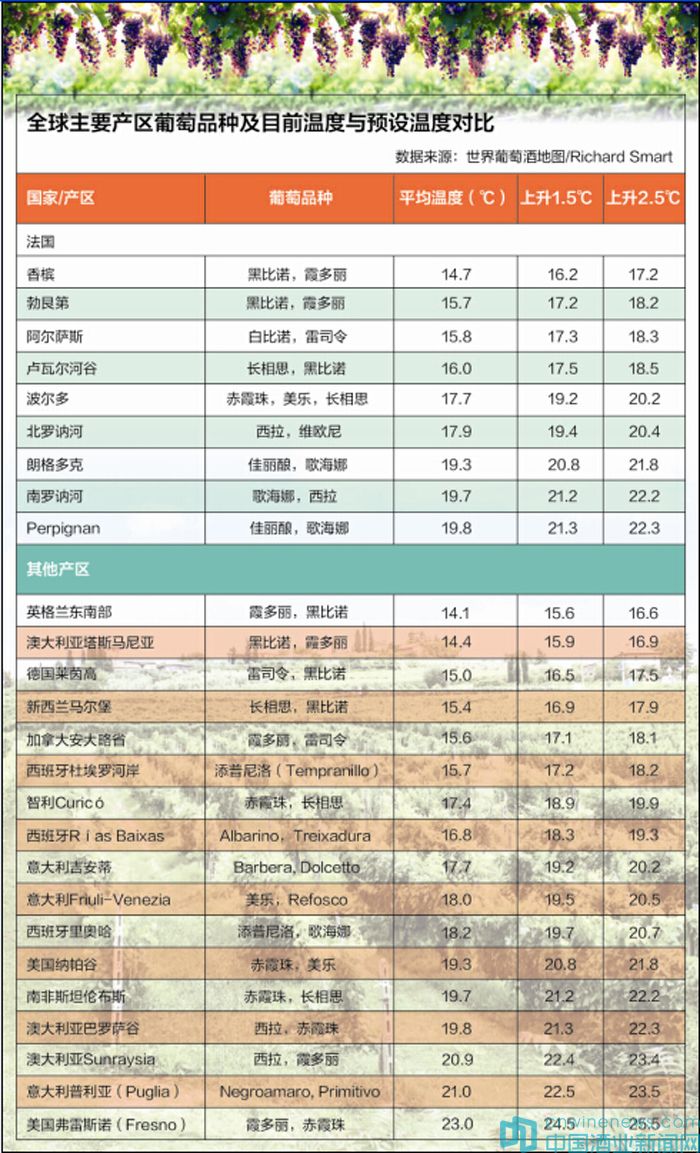 為了更好地體現熱量與品種之間的關系,與《世界葡萄酒地圖》一樣,圖表列出了各個葡萄品種生長期的平均溫度。他還預測了當氣溫上升1.5℃和2.5℃時,會產生什么樣的影響。