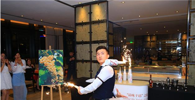 當晚,法國國家干邑行業管理局特別邀請調酒師在晚宴現場調配時尚的干邑雞尾酒。經過調酒師的巧思,干邑搖身一變,瞬即展現出萬種風情。而現場絢麗的花式調酒表演更是引發全場尖叫,將本場活動推至高潮。趁著余熱未退,調酒師又當場“收徒”,邀請六位來賓上臺調制經典的干邑雞尾酒。六位“學生”在臺上做得有模有樣,各有風格,臺下來賓也看得出神,贊嘆連連。全場彌漫著芬芳的干邑香氣,伴著美味的餐后甜點,來賓一同舉杯,用最后一杯干邑來為晚會劃上完美句號。