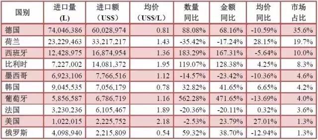 2016年1—4月,進口啤酒繼續保持增長,德國、荷蘭、西班牙暫列前三位。葡萄牙啤酒表現最為突出,前4個月進口額同比增速高達471.65%。
