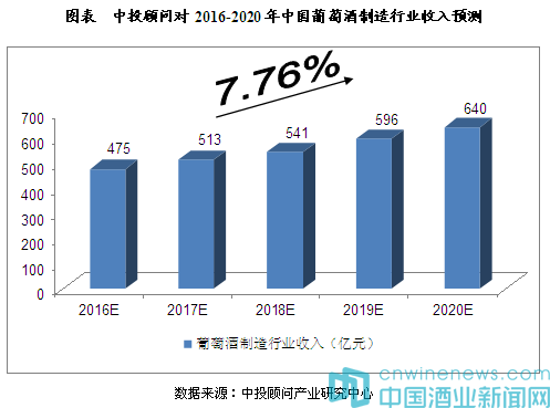 綜合以上因素,中投顧問發布的《2016-2020年中國葡萄酒市場投資分析及前景預測報告》預計,2016年我國葡萄酒制造行業收入將達到475億元,未來五年(2016-2020)年均復合增長率約為7.76%,2020年收入將達到640億元。