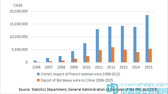 如果我們看一眼過去10年的法國葡萄酒進口數(shù)據(jù)就能發(fā)現(xiàn),從2006年開始,法國葡萄酒進口數(shù)量的增長率基本保持在70%以上,最多的時候增長率甚至超過了100%。2006年法國葡萄酒的進口量為76萬箱,2007年就達到了172萬箱。但到了2012年,進口量的增速下降到了8%,而2013年的增速幾乎為0,而2014年更是開始下滑。而波爾多葡萄酒的進口則量則下降幅度更大,雖然2015年市場開始回暖,但前景仍然不容樂觀。
