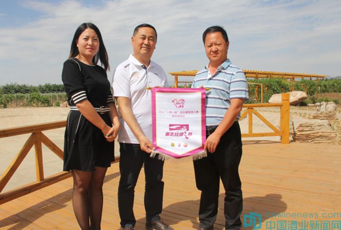 23日下午,小組首先來到內蒙古最大的葡萄酒生產企業(yè)漢森酒莊,漢森酒莊位于內蒙古自治區(qū)西部新興工業(yè)城市、“黃河明珠”烏海市。郭松泉代表BRWSC組委會照例向酒莊贈送重走絲路活動紀念版錦旗,北京市房山區(qū)葡萄種植及葡萄酒產業(yè)促進中心主任助理孟令奎向酒莊贈送董其昌手書的“寶藏”拓本。