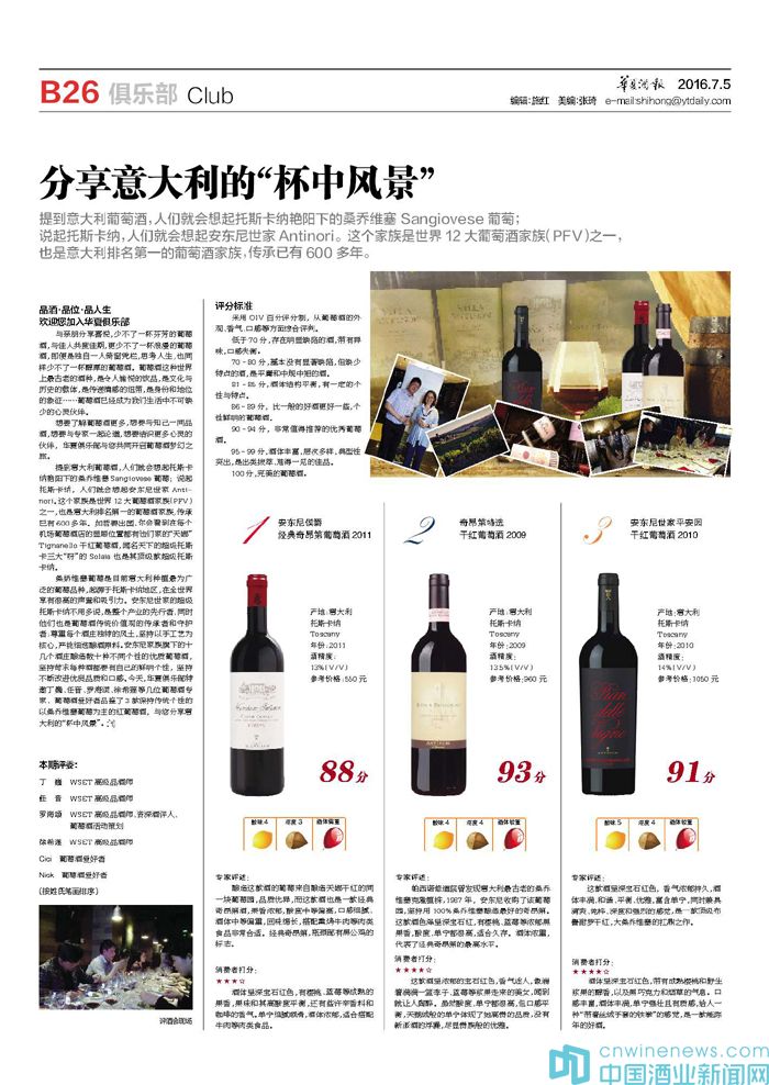 桑嬌維塞葡萄是目前意大利種植最為廣泛的葡萄品種,起源于托斯卡納地區,在全世界享有很高的聲譽和吸引力。安東尼世家的超級托斯卡納不用多說,是整個產業的先行者,同時他們也是葡萄酒傳統價值觀的傳承者和守護者:尊重每個酒莊獨特的風土,堅持以手工藝為核心,嚴挑細選釀酒原料。安東尼家族旗下的十幾個酒莊釀造數十種不同個性的優質葡萄酒,堅持苛求每種酒都要有自己的鮮明個性,堅持不斷改進優良品質和口感。今天,華夏俱樂部特邀丁巍、任音、羅海頌、徐希蓮等幾位葡萄酒專家、葡萄酒愛好者品鑒了3款保持傳統個性的以桑喬維塞葡萄為主的紅葡萄酒,與您分享意大利的“杯中風景”。