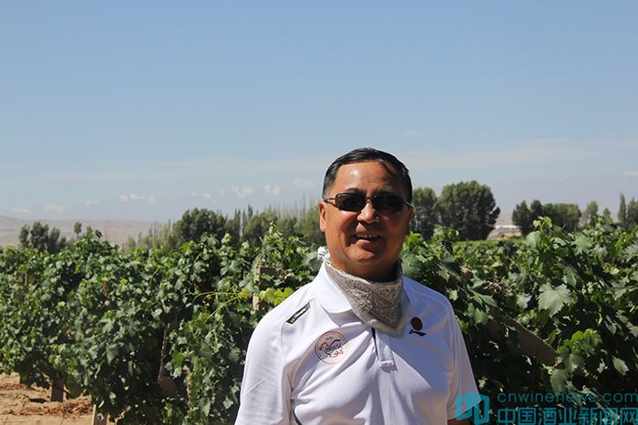 郭松泉在祁連酒業的萬畝葡萄園前留影