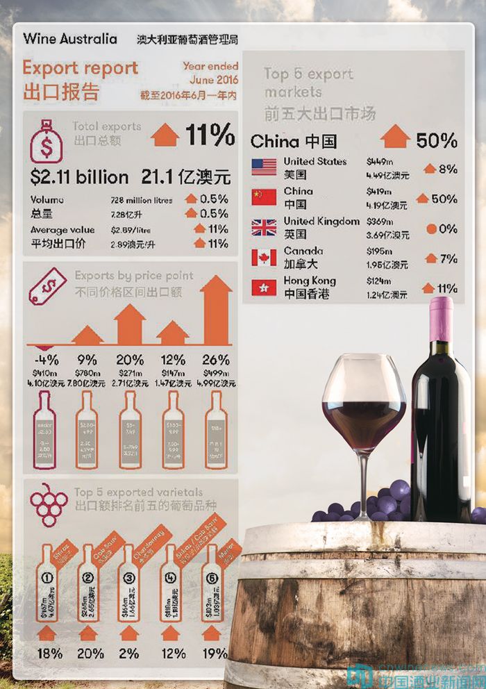 澳大利亞葡萄酒管理局(Wine Australia)最近發布的出口報告顯示,截至2016年6月底的一年內,澳大利亞葡萄酒出口額仍然保持著強勁的增長勢頭。其中,高端瓶裝酒增長勢頭強勁,離岸價格在10澳元/升及以上的澳大利亞葡萄酒對中國市場的出口劇增71%。中國已經成為澳大利亞葡萄酒的最大出口市場。