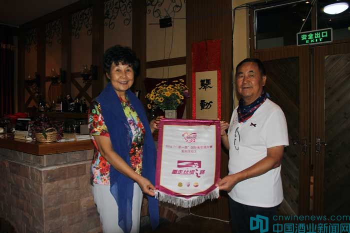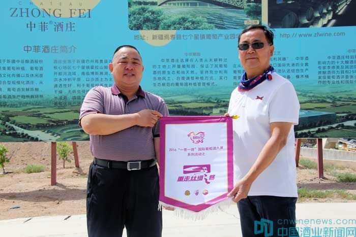 在中菲酒莊,“重走絲綢之路”團長、著名葡萄酒專家郭松泉、北京市房山區葡萄種植及葡萄酒產業促進中心高宏超和北京國際酒類交易金融部副總赫崢向紀昌峰贈送了“重走絲綢之路”錦旗。