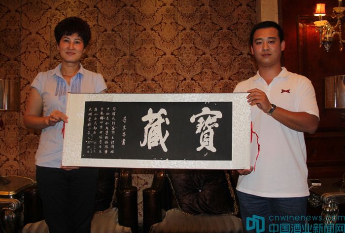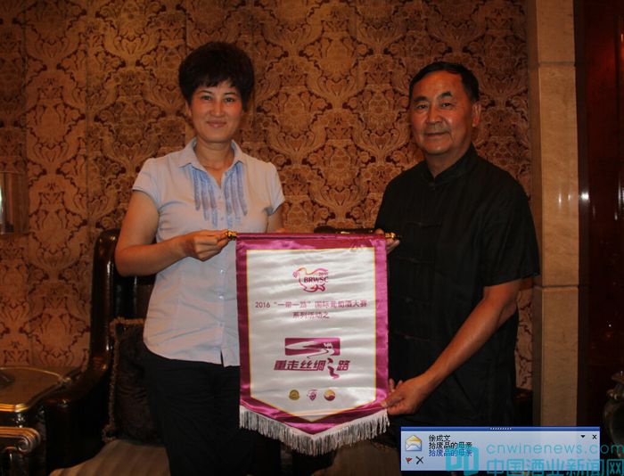 在當晚的接風宴上,“重走絲綢之路”團長、著名葡萄酒專家郭松泉,副團長、國家一級品酒師、著名葡萄酒專家張春婭向新疆酒局贈送了《新中國葡萄酒業五十年》和《國際葡萄釀酒法規》等書籍,北京市房山區葡萄種植及葡萄酒產業促進中心高宏超和北京國際酒類交易所金融部副總赫崢代表BRWSC組委會,向安紅贈送“重走絲綢之路”活動紀念版錦旗及董其昌手書的“寶藏”拓本。
