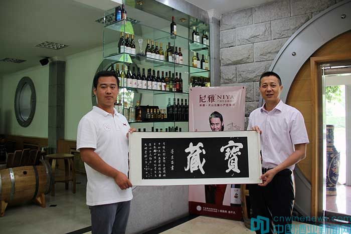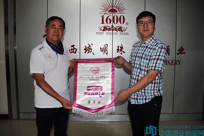 在中葡酒業,北京市房山區葡萄種植及葡萄酒產業促進中心高宏超和北京國際酒類交易所金融部副總赫崢,代表“一帶一路”葡萄酒大賽組委會向陳新軍、中葡酒業質量總監趙玉玲等贈送重走絲路活動錦旗及董其昌手書的“寶藏”拓本,并對其闡述在今年10月份北京房山舉行的“一帶一路”大賽的情況。