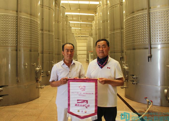 在走進和碩產區的過程中,北京市房山區葡萄種植及葡萄酒產業促進中心高宏超和北京國際酒類交易所金融部副總赫崢代表BRWSC組委會,向冠龍公司和國菲酒莊贈送了重走絲路活動錦旗及董其昌手書的“寶藏”拓本。
