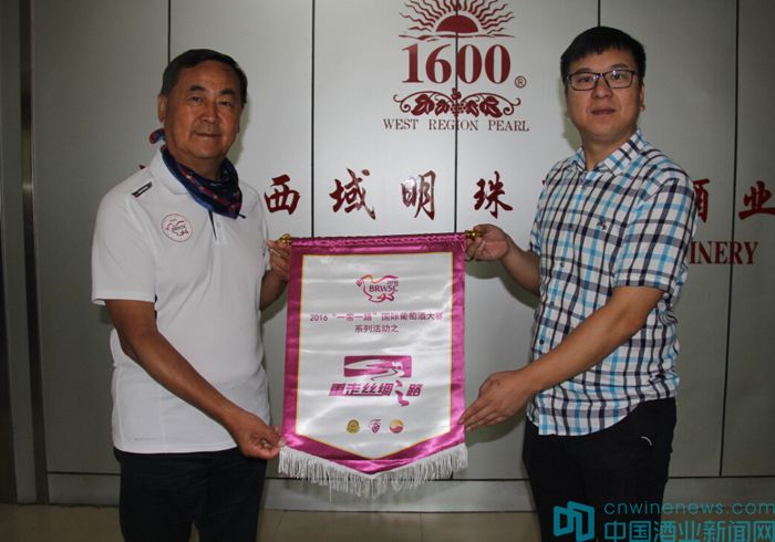 在中葡酒業,北京市房山區葡萄種植及葡萄酒產業促進中心高宏超和北京國際酒類交易所金融部副總赫崢,代表“一帶一路”葡萄酒大賽組委會向陳新軍、中葡酒業質量總監趙玉玲等贈送重走絲路活動錦旗及董其昌手書的“寶藏”拓本,并對其闡述了在今年10月份北京房山舉行的“一帶一路”大賽的情況。