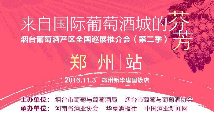 2016煙臺葡萄酒巡展推介會選擇在河南鄭州、湖北武漢、湖南長沙三地作重點推介。本次鄭州站活動由河南省酒業(yè)協(xié)會、華夏酒報、中國酒業(yè)新聞網(wǎng)聯(lián)合承辦,并得到了蓬萊市葡萄與葡萄酒局大力支持。