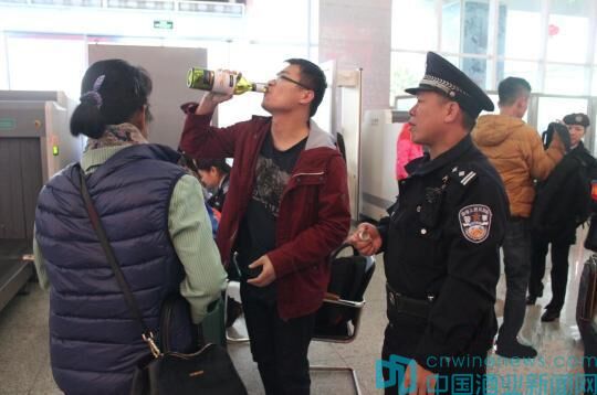 散裝白葡萄酒不能帶上動車,為收藏空瓶,一對母子在海口動車站安檢處當場豪飲起瓶中葡萄酒。