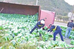 事故發(fā)生10余分鐘后,平壩區(qū)交警大隊(duì)民警正好巡邏至此,只見(jiàn)側(cè)翻的大貨車(chē)旁的路面上,滿是啤酒瓶,遠(yuǎn)遠(yuǎn)就能聞到啤酒味。巡邏交警韓警官立即停車(chē)組織救援,同時(shí)與指揮中心聯(lián)系。