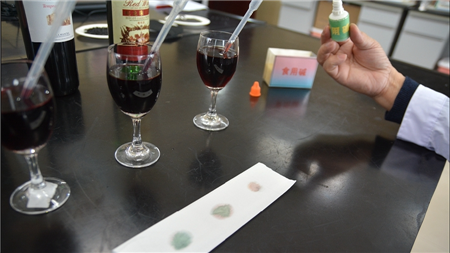 首先呂長富將三瓶葡萄酒依次取出一滴滴在餐巾紙上,隨后再將堿水(1:5)分別滴到剛滴到紙巾的葡萄酒中。