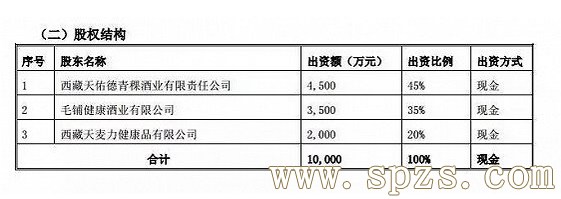 該公司注冊資本為1 億元,其中:西藏天佑德以自有資金出資4500萬元,占出資總額的45%;毛鋪健康酒業出資3500萬元,占出資總額的35%;西藏天麥力出資2000 萬元,占出資總額的20%。