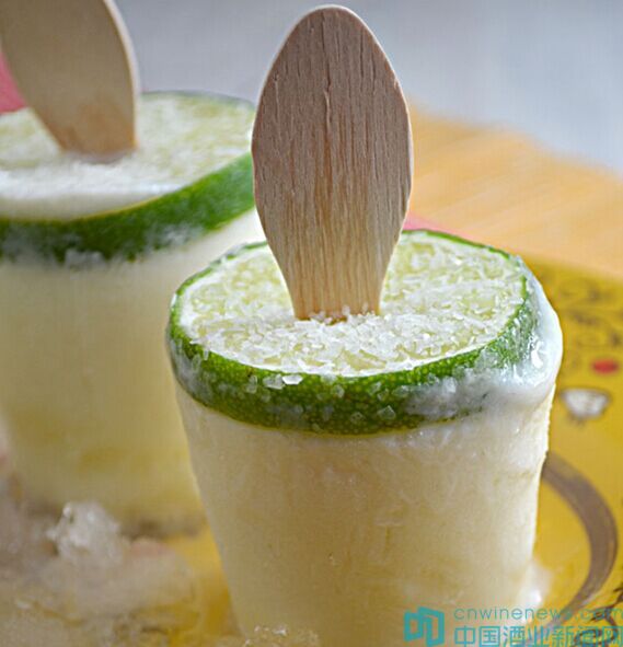 將青檸汁、煉乳、水和龍舌蘭酒混合均勻后倒入合適的冰格里,撒上少許鹽,把用小棍穿過(guò)切好的青檸切片輕輕放在液體上面,冷凍一夜。