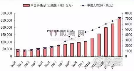 保健品行業(yè)規(guī)模與人均GDP相關(guān)性(單位:百萬元,美元)
