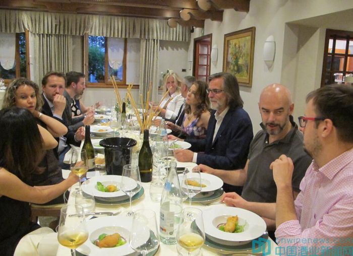 我們共品了五款葡萄酒,四白一紅,每一款都非常討喜,特別是后四款。第一款品嘗的是2015年份灰比諾(Pinot Grigio),淺檸檬色,中等濃郁度的香氣,略帶無花果、柚子、檸檬等氣息,清新易飲。第二款是2015年份長相思(Sauvignon Blanc),有濃郁的果香,百香果、無花果、微微的白色花香和青草香,非常平衡,在口中香氣一一展開,清新爽朗,回味很長;第三款2003年份Collio Bianco Col Disore很討喜 ,由四個葡萄品種調配,分別是白比諾(Pinot Bianco)、富萊諾(Fliulano)、長相思(Sauvignon Blanc)和麗波拉(Ribolla Gialla),有明亮的中等檸檬色,香氣在杯中一直有變化,初始有一點干草堆、藥香,后有一點干葡萄、蜂蜜等味道,所聞到的香氣在口中和諧展現,風味華美,濃郁和諧;第四款是2011年份長相思珍藏(Collio Sauvignon Riserva),白色的花香很顯著,另有無花果、成熟的青李子和青蘋果等香味,在口中酒精度稍微有些明顯,但又不失清新。最后一款2005年份Collio Rosso Riserva degli Orzoni大愛,也是此行中發(fā)現的最好喝的紅葡萄酒,14%的酒精度,深寶石紅色,有非常吸引人的中高濃郁度香氣,紅色水果、山楂、干玫瑰花、干木、香料及好聞的香草等香氣,這些香氣在口中全部展現,還有一點陳年所帶來的動物皮毛味,風味濃郁,單寧細柔,整體感覺是一款精致柔和的卓越葡萄酒,狀態(tài)仍然很年輕,還可陳年多年。