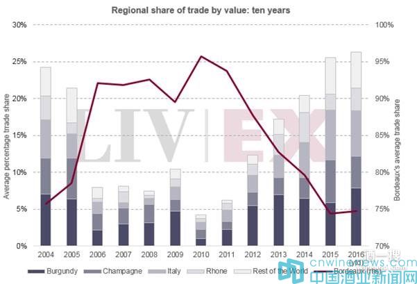 在交易所上,經常有來自世界不同各地的葡萄酒進行交易;今年已包括了新西蘭、黎巴嫩和智利等優質葡萄酒。如下圖所示,它們所屬的“世界其它酒區”組別,在最近幾年的市場份額已有所上升。