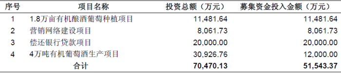 本次募集資金為5.15億元,將用1.8萬畝有機釀酒葡萄種植項目、營銷網絡建設項目、償還銀行貸款項目和4萬千升有機葡萄酒生產項目。