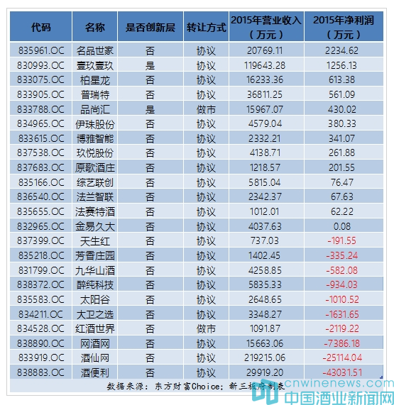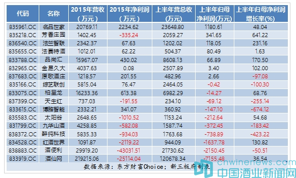 根據各家披露的財務數據,名品世家2015年凈利潤為2234.62萬元,遠超創新層的壹玖壹玖。此外,仍有43%的酒類企業屬于虧損狀態,如2015年虧損4.3億元的酒便利以及虧損2.51億元的酒仙網。