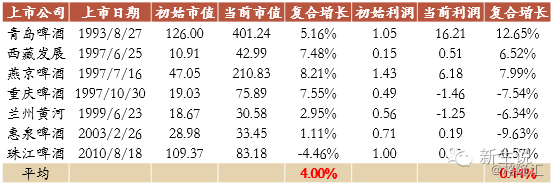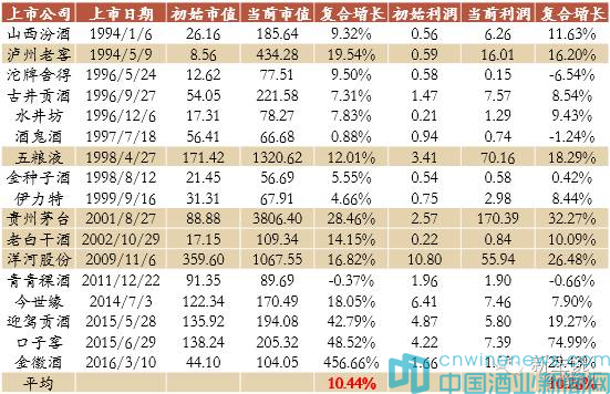 如果把上市以來市值和凈利潤年復合增長率高于10%作為一個衡量的指標,我們發現白酒行業中有5家,分別為瀘州老窖(000568)、五糧液(000858)、貴州茅臺、老白干酒(600559)和洋河股份(002304),在13家2014年之前上市的公司中,占比達到38.46%。黃酒行業中有1家,占比為50%;而啤酒和葡萄酒行業中一家也沒有,占比分別為0%。也就是說黃酒和白酒出現牛股的概率都在38%以上,而啤酒和葡萄酒所有上市公司從來沒有出現過牛股。
