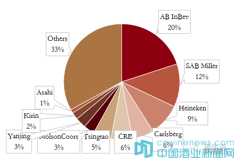 由美銀美林(Bank of America MerrillLynch)出具的調查報告顯示,2014年世界上大約一半的啤酒生產來自以下四家著名的行業巨頭,包括百威英博(Anheuser-BuschInBev)、南非米勒(SABMiller)、喜力啤酒(Heineken)以及嘉士伯啤酒公司(Carlsberg)。(說明:2014年數據,現南非米勒已經被百威英博收購)