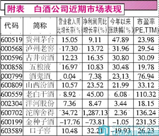 而量價齊升的局面也讓貴州茅臺、五糧液等一線白酒企業(yè)保持了不錯的業(yè)績增長(祥見附表)。如貴州茅臺今年終端銷售價格大幅上漲的1~9月收入266億元,同比增長15.05%,位列所有白酒公司收入第一,凈利潤同比增長9.11%。與此同時,貴州茅臺股價漲幅已經(jīng)接近50%。