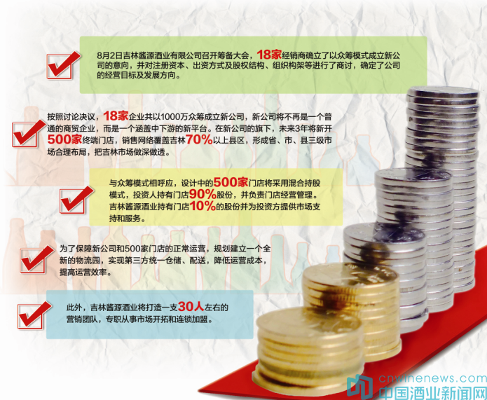 這個設想很快得到落實,也得到諸多經銷商的呼應。8月2日吉林醬源酒業有限公司召開籌備大會,18家經銷商確立了以眾籌模式成立新公司的意向,并對注冊資本、出資方式及股權結構、組織構架等進行了商討,確定了公司的經營目標及發展方向。