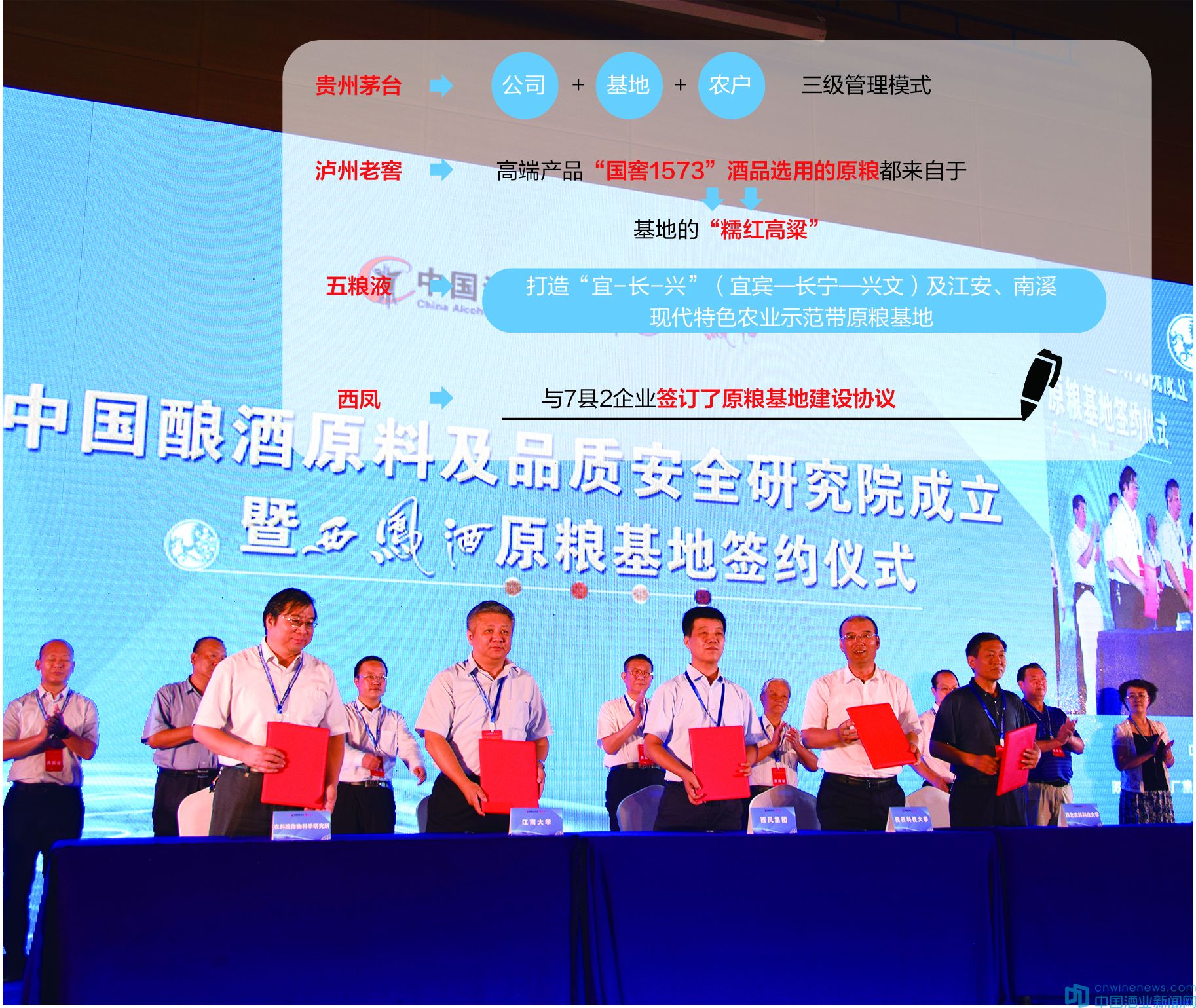 8月20日,陜西西鳳酒廠集團(tuán)有限公司與鳳翔縣、岐山縣、扶風(fēng)縣、千陽縣、宜君縣、佳縣、城固縣、陜西旅游集團(tuán)、鳳翔縣朝陽現(xiàn)代農(nóng)業(yè)有限公司簽訂了西鳳酒原糧基地建設(shè)協(xié)議。