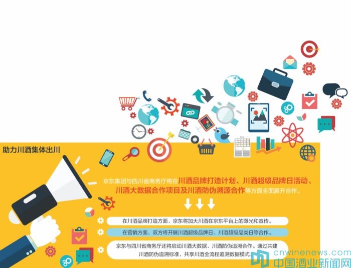 9月20日,京東集團與四川省商務廳正式簽署《“互聯網+白酒”產業戰略合作協議》。根據協議,雙方將加速川酒品牌在電商互聯網大潮下的戰略布局,同時在資源整合、市場營銷、品牌培育、大數據、技術等方面給予四川本地白酒品牌全面助力,共同促進四川白酒產業優化升級,推動“川酒出川”計劃。