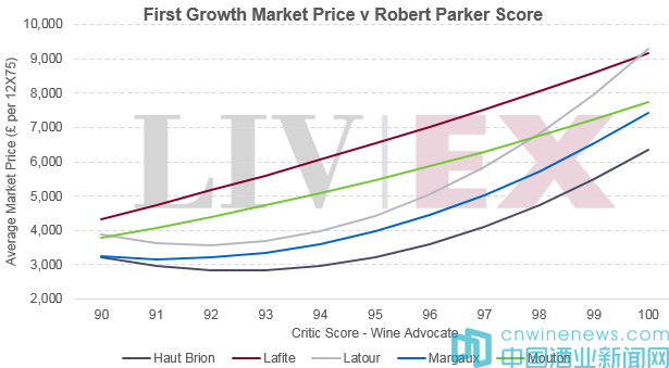 有趣的是,越高得分的侯伯王Haut Brion、拉圖Latour和瑪歌Margaux,它們的價(jià)格敏感度似乎越高:越接近100滿分,它們與拉菲和木桐Mouton Rothschild趨勢(shì)線之間的差距便開(kāi)始減小。拉菲和木桐趨勢(shì)線的傾斜度較少,也許這是因?yàn)樗鼈冊(cè)趤喼迵碛刑貏e多的追隨者,而那里的品牌購(gòu)買為主導(dǎo),所以高得分的重要性相對(duì)較低。