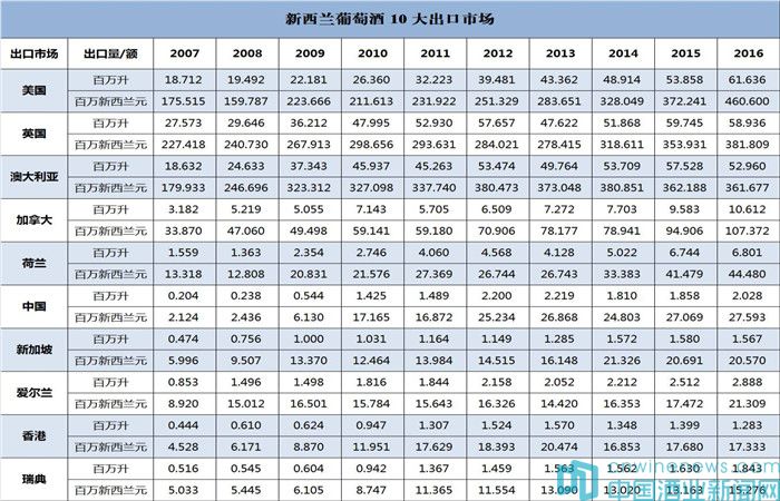 2016年,在出口量上,美國取代英國成為了新西蘭葡萄酒的最大出口市場;而在出口額上,美國再次穩坐第一。